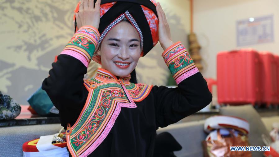 Artist Wen Anmei prepares for a dance to greet the advent of the New Year in Ameiqituo Town of Qinglong County, Qianxinan Buyi-Miao Autonomous Prefecture of southwest China's Guizhou Province, Dec. 31, 2020. (Xinhua/Liu Qinbing)