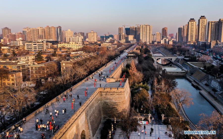 Aerial photo taken on Jan. 1, 2021 shows people visiting the ancient city wall at sunset in Xi'an, northwest China's Shaanxi Province. (Xinhua/Tao Ming)