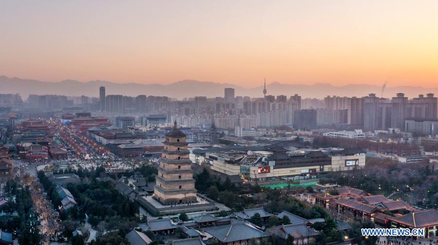Aerial photo taken on Jan. 1, 2021 shows the sunset scenery in Xi'an, northwest China's Shaanxi Province. (Xinhua/Tao Ming)