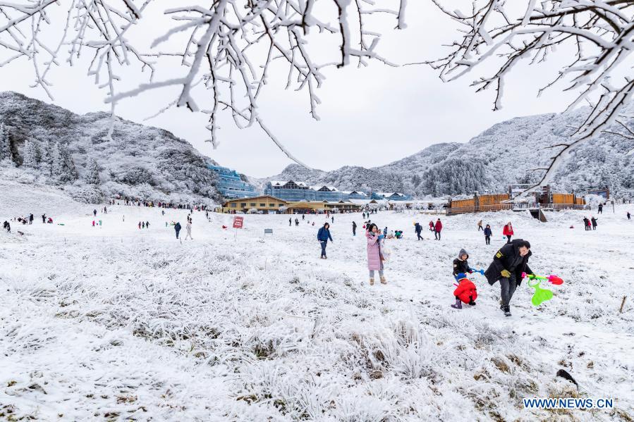 People have fun in the snow covered Jinfo Mountain in Nanchuan District of southwest China's Chongqing, Jan. 1, 2021. (Photo by Qu Mingbin/Xinhua)