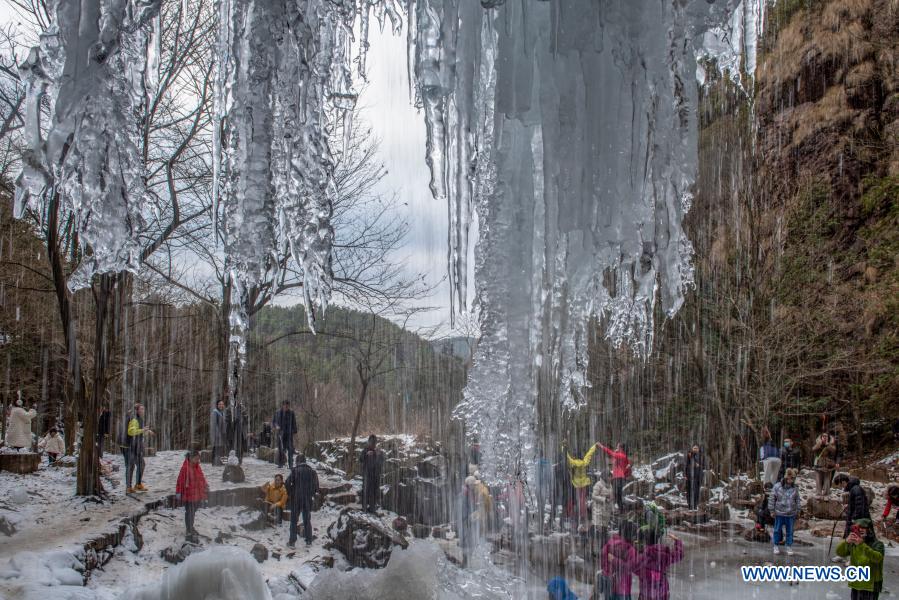 People enjoy the scenery of a frozen waterfall at Siming Mountain in Yuyao City, east China's Zhejiang Province, Jan. 3, 2021. (Photo by Zhang Hui/Xinhua)