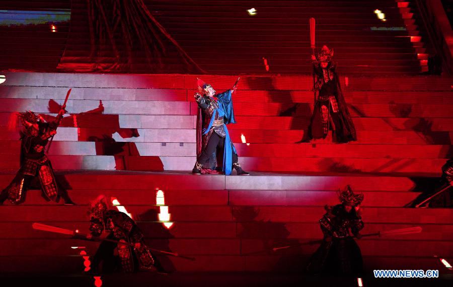 Photo taken on Jan. 1, 2021 shows the performance at the Tengwang Pavilion in Nanchang, capital of east China's Jiangxi Province. The performance, combining holographic digital imaging technology and other artistic techniques, shows the history and rich culture of the Tengwang Pavilion. (Xinhua/Wan Xiang)