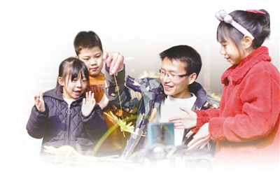 A craftsman teaches children how to make handicrafts with bamboo strips in the International Intangible Cultural Heritage Town in Xiuhu Park of Bishan District, Chongqing municipality in southwest China. (Photo/Hu Yuejian)