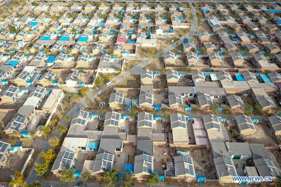 Aerial photo taken on Nov. 5, 2020 shows a view of Yuanlong Village of Minning Township in Yinchuan, northwest China's Ningxia Hui Autonomous Region. Xihaigu, one of China's most impoverished areas located in Ningxia, saw its last impoverished county removed from the national poverty list on Nov. 16, 2020. Over 60,000 farmers in Xihaigu have been relocated to Minning Township, which has converted from a town in Gobi desert to a modernized ecological relocation demonstration town over the past two decades via a series of cooperation between Ningxia and southeast China's Fujian Province. The victory is regarded as another landmark in China's campaign to eradicate absolute poverty, during which "she power" played an indispensable role. In 2019, an e-commerce poverty alleviation workshop, which sold specialties of Ningxia, was established in Yuanlong Village of Minning. It employed 42 women from impoverished households. In 2020, due to the outbreak of COVID-19, the workshop decided to sell the products via livestreaming to promote sales. It set up a livestreaming team consisting of six female employees including Hai Yan, Ma Yan, Bai Xiyan, Ma Yunsu, Ma Danli, and Yang Junying. Most of the team members had dropped out of school before entering middle school, but they accepted the challenges and learned new skills from scratch with great enthusiasm. From negotiating with merchants to introducing products in front of cameras to audiences, they are able to handle different works with more confidence. (Xinhua/Wang Peng)