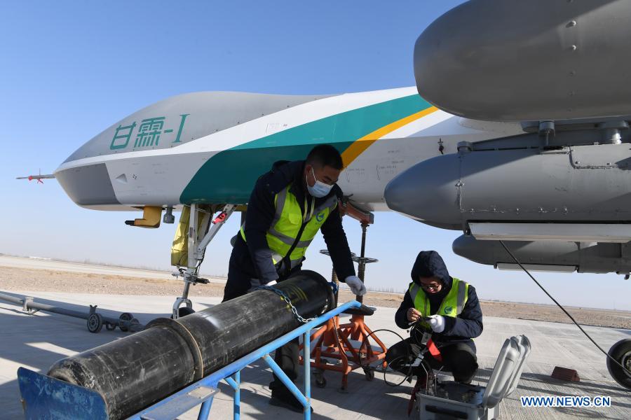 Technicians prepare large UAV, Ganlin-1, meaning "sweet rain" in Chinese, for its maiden flight at Jinchuan airport in Jinchang City in northwest China's Gansu Province, Jan. 6, 2021. China deployed a large unmanned aerial vehicle (UAV) on Wednesday for generating artificial precipitation in northwest China's Gansu Province, with an aim of boosting ecological protection. During its maiden voyage, which lasted around 40 minutes, Ganlin-1 maintained stable flight and successfully conducted weather-modification operations, such as atmospheric detection and catalyst spreading to generate precipitation, as well as the de-icing of the UAV itself. This innovative move in ecological protection marks the launch of China's first large UAV-based weather-modification system, filling the country's gap in the field. The UAV is capable of long-range atmospheric sounding, air-data acquisition and catalyst seeding for precipitation enhancement, according to the developer. (Xinhua/Fan Peishen)