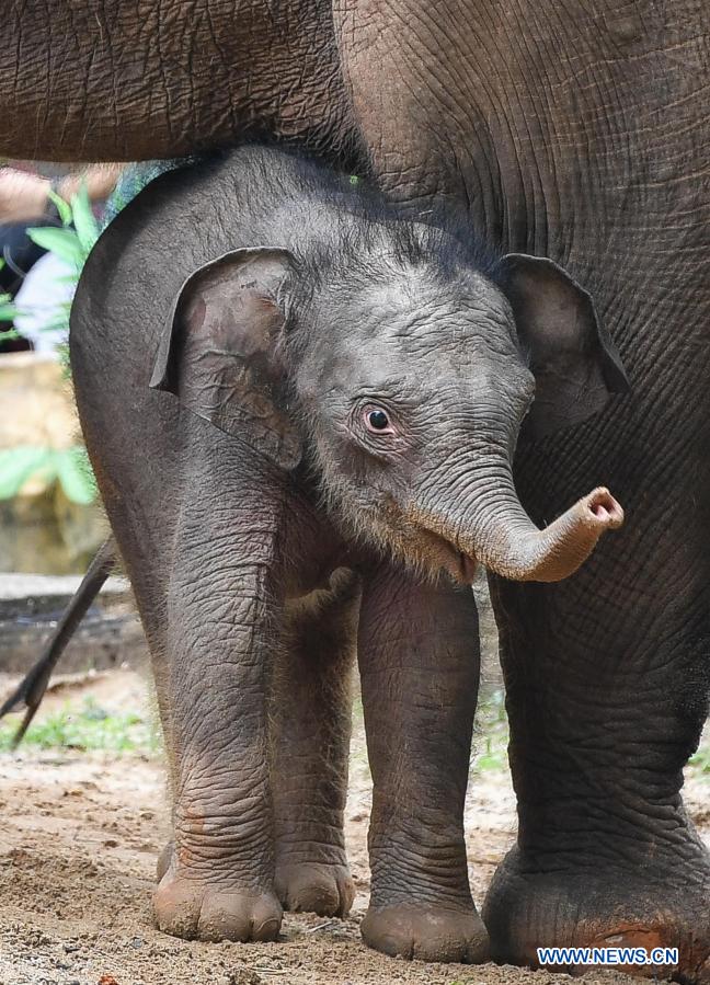 A baby Asian elephant walks with its mother at the Chimelong Safari Park in Guangzhou, south China's Guangdong Province, May 27, 2020. (Xinhua/Liu Dawei)