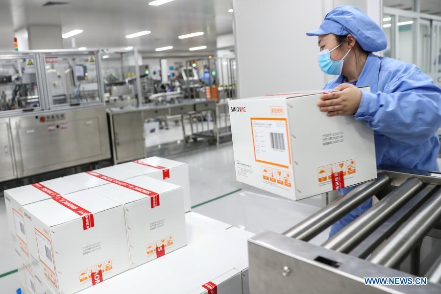 A staff member carries a box of COVID-19 vaccines at a packaging plant of Sinovac Research and Development Co., Ltd. in Beijing, capital of China, Jan. 6, 2021. The COVID-19 vaccine inoculation among specific groups of people with higher infection risks has started across China recently. Vaccine developing companies including Sinovac Research and Development Co., Ltd. are busy producing COVID-19 vaccines to ensure the inoculation being conducted orderly. (Xinhua/Zhang Yuwei)