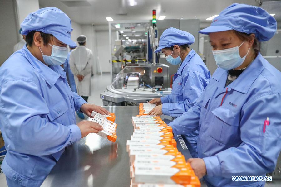 Staff members work at a COVID-19 vaccine packaging plant of Sinovac Research and Development Co., Ltd. in Beijing, capital of China, Jan. 6, 2021. The COVID-19 vaccine inoculation among specific groups of people with higher infection risks has started across China recently. Vaccine developing companies including Sinovac Research and Development Co., Ltd. are busy producing COVID-19 vaccines to ensure the inoculation being conducted orderly. (Xinhua/Zhang Yuwei)
