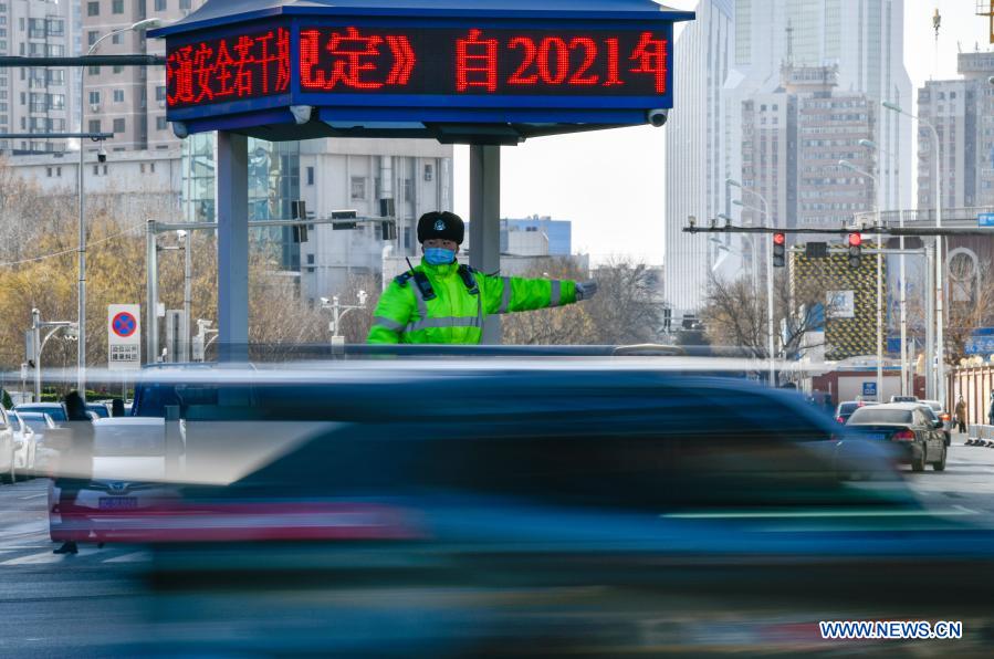 A police officer guides traffic at Heping District in north China's Tianjin, Jan. 6, 2021. Many workers stick to their posts outdoors as the city experiences a strong cold wave that started on Wednesday. (Photo by Sun Fanyue/Xinhua)