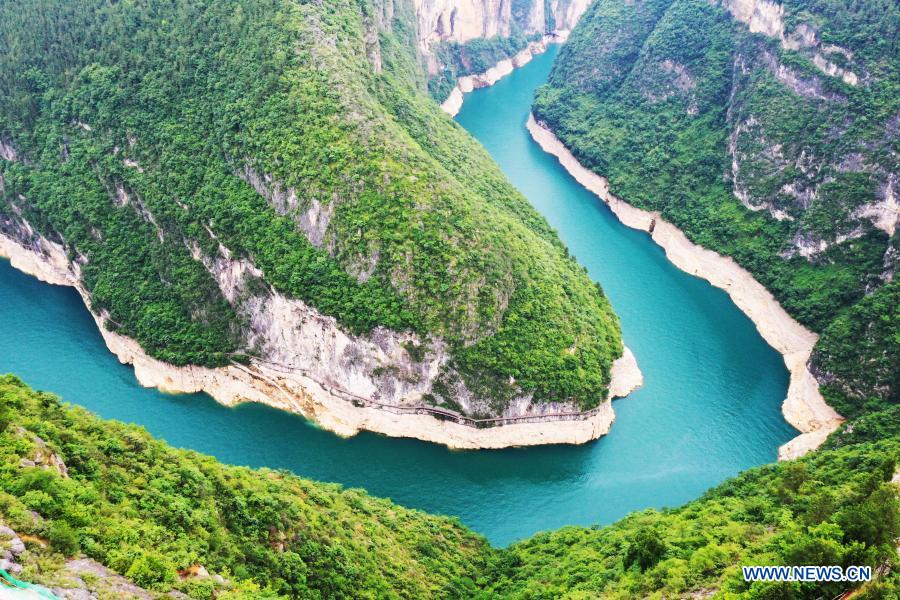 Aerial photo taken on May 26, 2020 shows the view of Yutouwan on a tributary of the Yangtze River in Wushan County, southwest China's Chongqing. In recent years, Chongqing has continuously built up important ecological barriers in the upper reaches of the Yangtze River by strengthening ecological restoration. The ecological environment in the Chongqing section of the Yangtze River has been continuously improved. (Xinhua/Wang Quanchao)