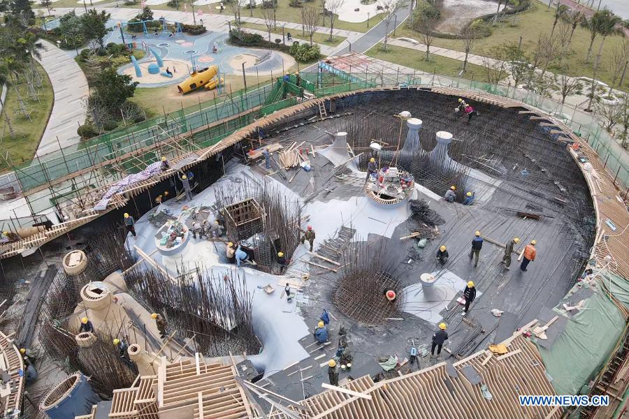 Aerial photo taken on Jan. 6, 2021 shows the construction site of the Wormhole Library in the Haikou Bay in Haikou, capital city of south China's Hainan Province. The Wormhole Library is designed as a landmark in the public life in the Haikou Bay. (Xinhua/Zhang Liyun)