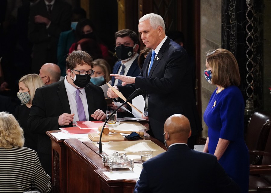 U.S. Vice President Mike Pence (C) and U.S. House Speaker Nancy Pelosi (R) take part in a joint session of the Congress to certify the 2020 election results at the U.S. Capitol in Washington, D.C., the United States, Jan. 6, 2021. (Kevin Dietsch/Pool via Xinhua)