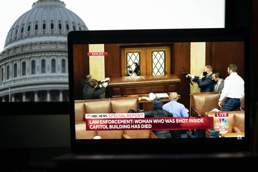 Security staff in the U.S. Capitol building reacting to the chaotic situation in a video feed from NBC news is displayed on a screen in Arlington, Virginia, the United States, on Jan. 6, 2021. (Xinhua/Liu Jie)
