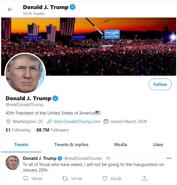 The screengrab taken from U.S. President Donald Trump's Twitter account shows he tweeted on Jan. 8, 2021 "To all of those who have asked, I will not be going to the Inauguration on January 20th." (Xinhua)