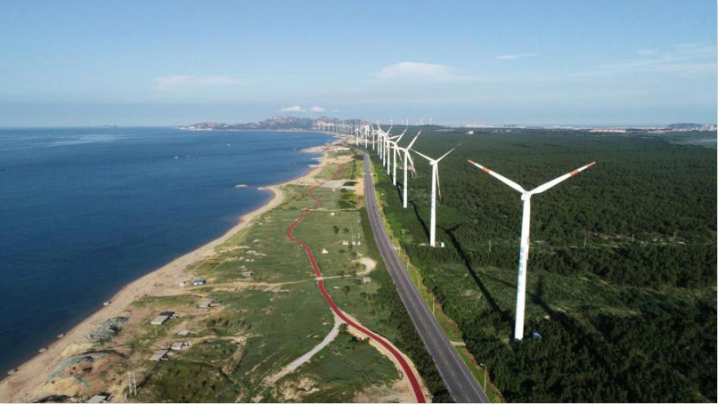 Wind turbines are erected along a coastal road in Rongcheng, east China's Shandong province, July 28, 2020. (Photo by Wang Fudong/People's Daily Online)