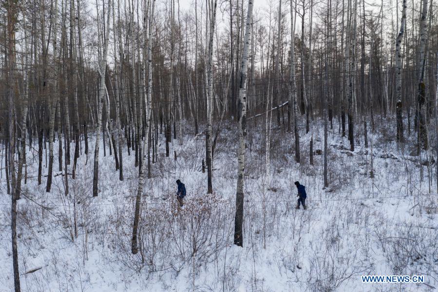 Aerial photo taken on Jan. 12, 2021 shows Lyu Jiansheng and Wang Shaoting conducting power line patrol in the forest near Beiji Village of Mohe City, northeast China's Heilongjiang Province. Beiji Village, located in Mohe City, the northernmost city in China, could only rely on small diesel generators for power supply before 2007. After connecting to the State Grid, Beiji Village set up the northernmost power supply station in China, the Beiji Power Supply Station. Director Lyu Jiansheng and meter reader Wang Shaoting are the only two staff members of the station which is in charge of more than 20 kilometers of overhead lines and 70 kilometers of buried cable lines around it. The temperature in the village often drops to below minus 40 degrees Celsius, and they patrol along the line every once in a while. In 2020, the power supply station renovated multi-functional exhibition hall and canteen, purchased kitchenware and installed bathroom. "Now the working and living conditions are getting better and better. We are proud of this job. It is our duty and mission to ensure the normal electricity supply in the village," Lyu Jiansheng said. (Xinhua/Xie Jianfei)