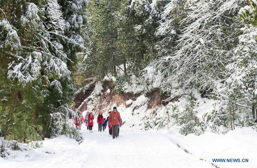 Students from Huchangbao Primary School participate in educational activities at a camp in Longcanggou National Forest Park in Yingjing County, southwest China's Sichuan Province, Jan. 13, 2021. Recent years Yingjing County has organized a series of educational activities in Longcanggou National Forest Park to boost local education in natural environment. (Xinhua/Liu Mengqi)