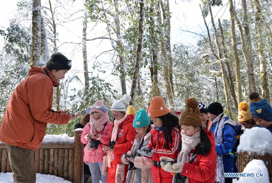 Students from Huchangbao Primary School learn to use compass in Longcanggou National Forest Park in Yingjing County, southwest China's Sichuan Province, Jan. 13, 2021. Recent years Yingjing County has organized a series of educational activities in Longcanggou National Forest Park to boost local education in natural environment. (Xinhua/Liu Mengqi)