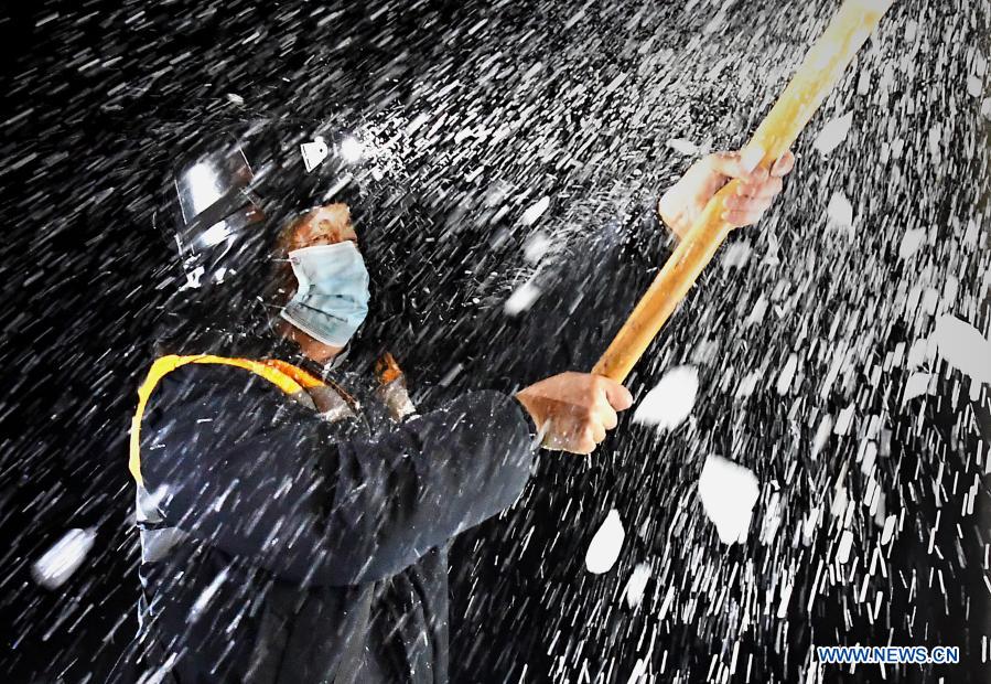 Guo Zhenzhong clears icicles off Guanyintang tunnel wall in Luoyang, central China's Henan Province, Jan. 12, 2021. Every year in winter, railway workers like Guo Zhenzhong are responsible for clearing icicles due to water seepage in railway tunnels to ensure safe operation of trains in Luoyang. "It is common to clear icicles four or five times a day. In extremely cold weather, it takes nine times at most. It takes me 26,000 steps to clear icicles in the 600-meter Guanyintang tunnel in a day, "Guo Zhenzhong said. (Xinhua/Li An)