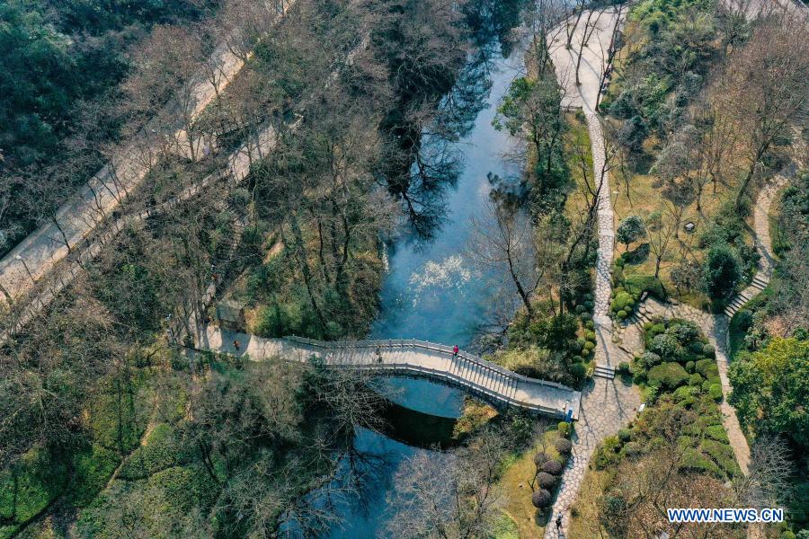Aerial photo taken on Jan. 15, 2021 shows the scenery of Ahahu national wetland park in Guiyang, capital of southwest China's Guizhou Province. Local authorities in Guiyang have built 660 parks since 2015, including forest park, wetland park, mountain park and so on, adding the total number of parks here to 1,025 by far. (Xinhua/Ou Dongqu)