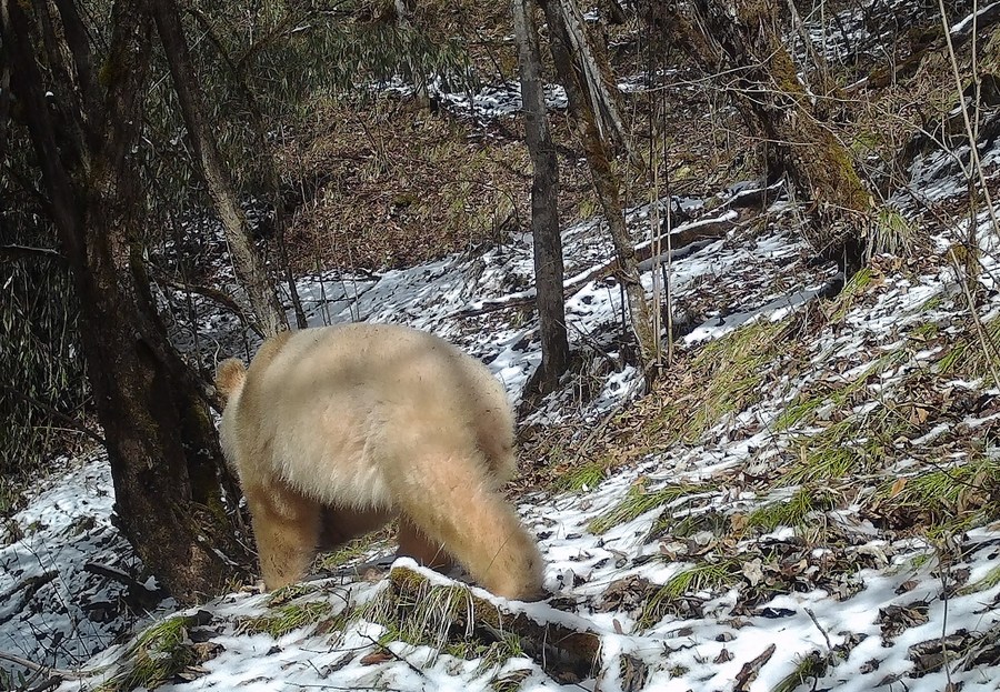 An all-white panda is captured by an infrared camera in the Wolong National Nature Reserve in Sichuan Province, southwest China in February 2020. (Photo provided to Xinhua)