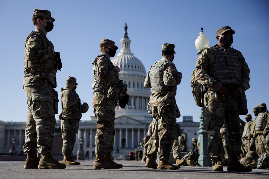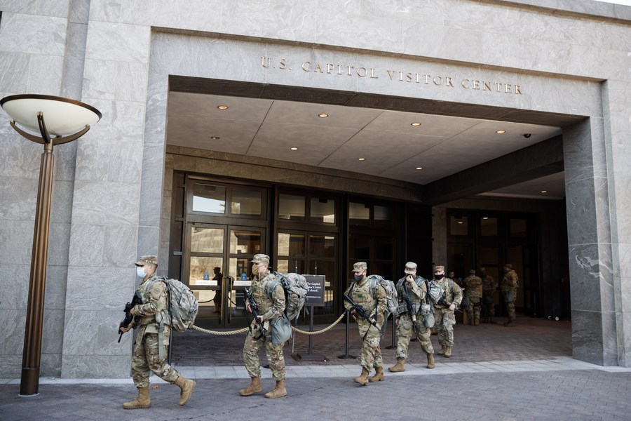 National Guard soldiers are seen on Capitol Hill in Washington, D.C., the United States, on Jan. 14, 2021. U.S. (Photo by Ting Shen/Xinhua)