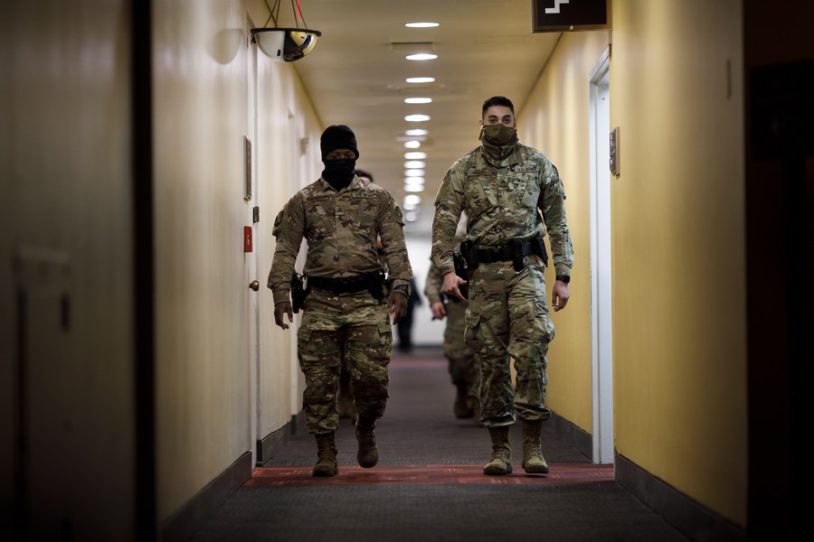 National Guard soldiers are seen on Capitol Hill in Washington, D.C., the United States, on Jan. 14, 2021. (Photo by Ting Shen/Xinhua)