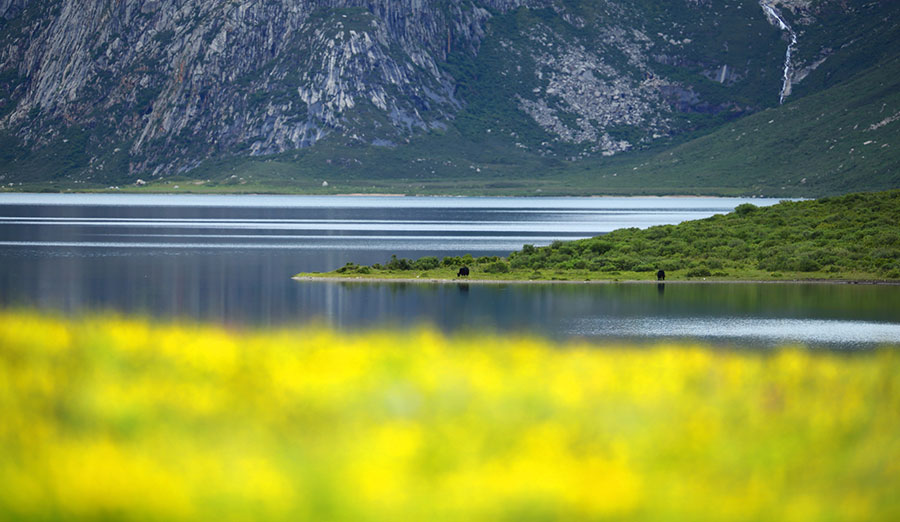 Two yaks walk on a lake bank in Nianbaoyuze. (Photo/Liu Huan)