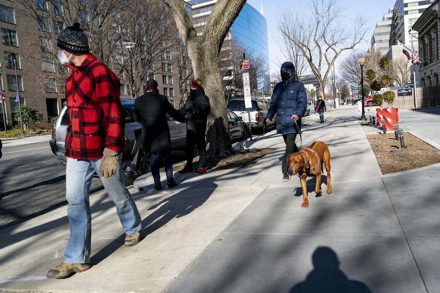 People wearing face masks are seen near the U.S. Capitol building in Washington, D.C., the United States, on Jan. 18, 2021. (Xinhua/Liu Jie)