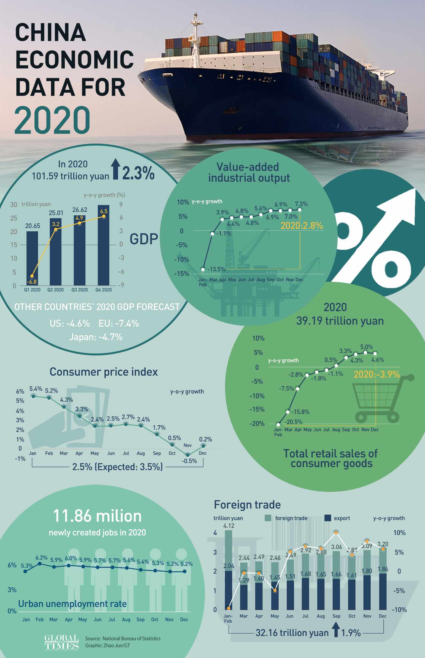 China's GDP grew 2.3 percent to 101.6 trillion yuan in 2020, meaning it is expected to be the only major economy in the world to have positive growth, according to data released by the National Bureau of Statistics (NBS) on Monday. It also marked the first time that the country's economic volume stepped into a new era to exceeding 100 trillion yuan.