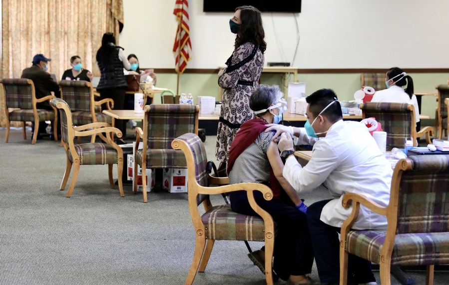 Residents receive COVID-19 vaccines in Pasadena, Los Angeles County, California, the United States, Jan. 15, 2021. (Xinhua)
