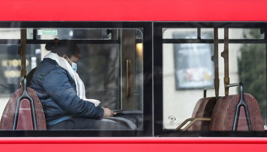 A woman wearing a face mask is seen in a bus in London, Britain, Jan. 8, 2021. (Xinhua/Han Yan)