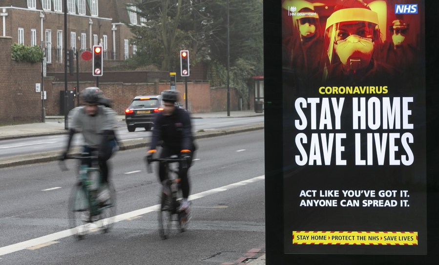 People cycle past an advertising board reading "Stay Home Save Lives" in London, Britain, Jan. 10, 2020. (Xinhua/Han Yan)