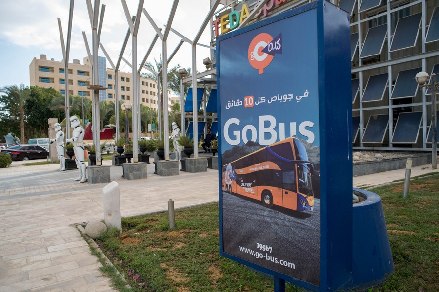 Photo taken on Jan. 14, 2021 shows a poster of Go Bus company at China-Egypt TEDA Suez Economic and Trade Cooperation Zone in Ain Sokhna, Egypt. (Xinhua/Wu Huiwo)