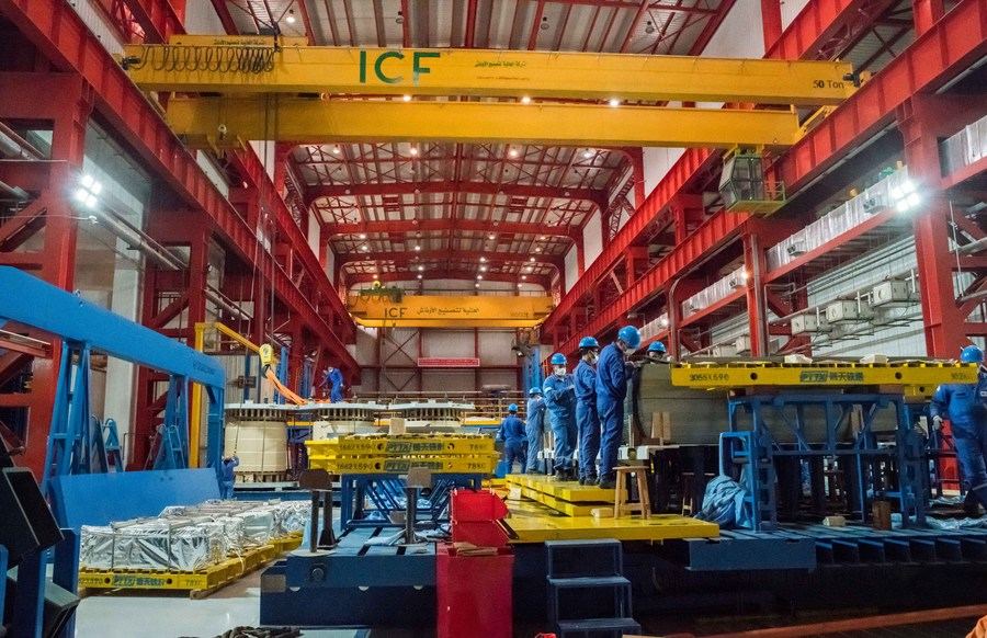 Workers are seen at a workshop of XD-EGEMAC High Voltage Electric Equipment Co., Ltd. at China-Egypt TEDA Suez Economic and Trade Cooperation Zone in Ain Sokhna, Egypt, Jan. 14, 2021. (Xinhua/Wu Huiwo)