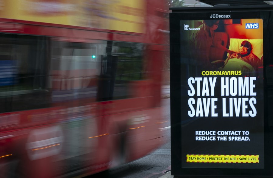 A bus drives past an advertising board reading "Stay Home Save Lives" in London, Britain, Jan. 10, 2021. (Xinhua/Han Yan)