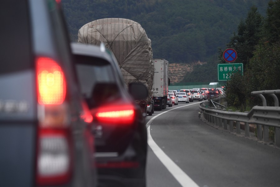 Photo taken on Oct. 6, 2020 shows a traffic jam on an expressway near Minqing County of Fuzhou City, southeast China's Fujian Province. (Xinhua/Song Weiwei)