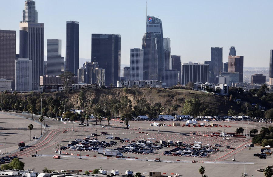 Motorists line up to receive inoculation at a COVID-19 vaccination site at Dodger Stadium in Los Angeles, California, the United States, Jan. 15, 2021. (Xinhua)