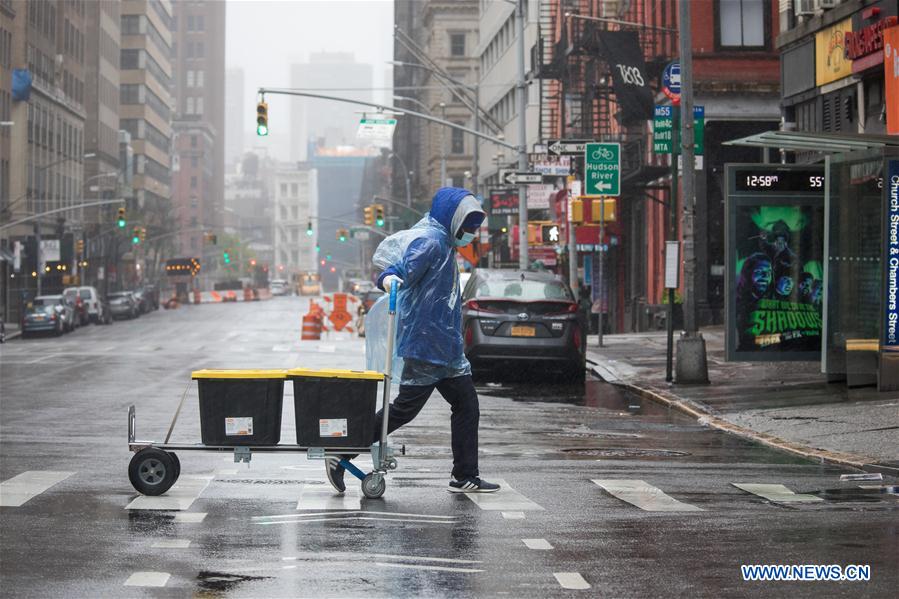 A worker wearing a mask delivers packages during the COVID-19 pandemic in New York, the United States, April 13, 2020.  (Photo by Michael Nagle/Xinhua)