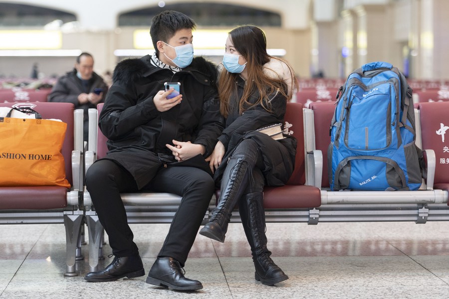 Passengers wait for trains at Harbin Railway Station in Harbin, northeast China's Heilongjiang Province, Jan. 28, 2021. (Xinhua/Xie Jianfei)