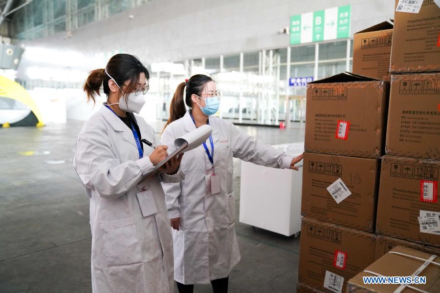 Medical members from the Fourth Affiliated Hospital of Harbin Medical University count medical materials in the reserve area of the "Huoyan" nucleic acid test laboratory in Harbin, northeast China''s Heilongjiang Province, Jan. 30, 2021. The "Huoyan" laboratory will soon be put into use to fight the COVID-19 pandemic in Harbin. (Xinhua/Wang Song)