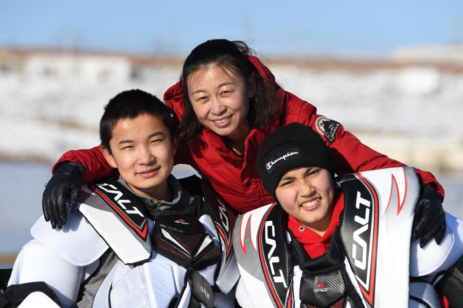 At an outdoor rink in northwest China's Xinjiang Uygur Autonomous Region, 8-year-old Bahe Dana is learning how to play ice hockey goalie. "I like this game because it's cool to play and you can get to ice skate," says Bahe, one of the first generation in China to grow up with ice hockey.