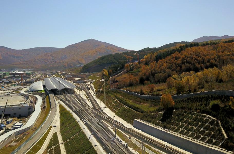 The aerial photo taken on Sept. 26, 2020 shows Taizicheng station of the Beijing-Zhangjiakou high-speed railway line in Chongli District of Zhangjiakou city, north China's Hebei Province. (Xinhua/Zhang Chenlin)