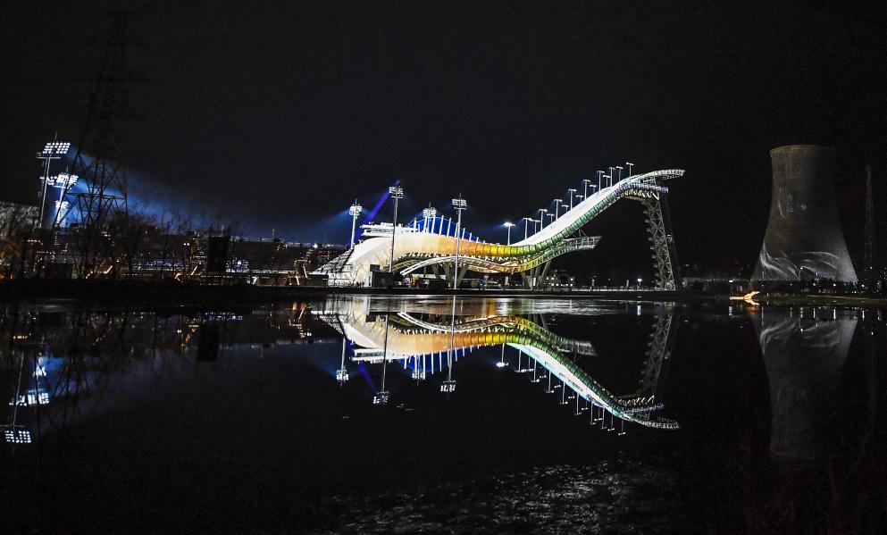 The photo taken on Dec. 14, 2019 shows the evening view of Big Air Shougang, the venue for Beijing 2022 Winter Olympic Games in Beijing. (Xinhua/Xia Yifang)