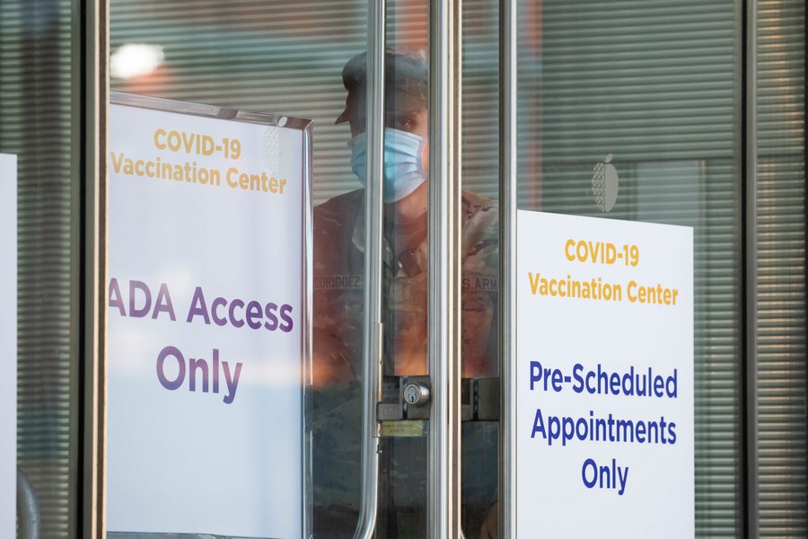 A National Guard member stands at a COVID-19 vaccination center at the Jacob K. Javits Convention Center in New York, the United States, Jan. 23, 2021. (Photo by Michael Nagle/Xinhua)