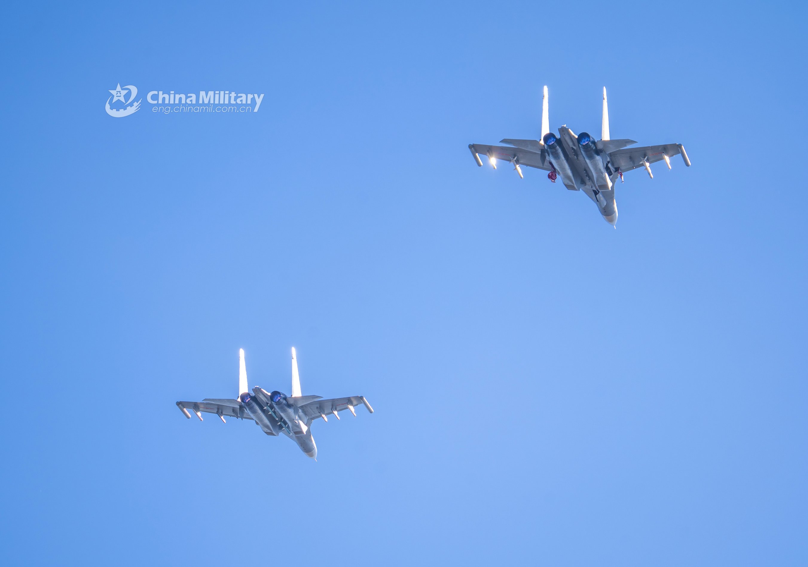 Two fighter jets attached to a naval aviation brigade under the PLA Eastern Theater Command fly in formation during a round-the-clock flight training exercise in mid January, 2021. (eng.chinamil.com.cn/Photo byTian Jianmin)