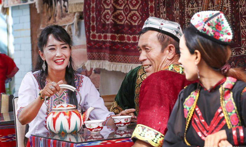 Owner (1st L) of the tourist yard "Guli's Home" chats with staff in Kashgar, northwest China's Xinjiang Uygur Autonomous Region, Aug. 7, 2018. Located in the ancient city of Kashgar, "Guli's Home", a local resident's yard converted into a tourist resting place, has become a hot tourist attraction where visitors can experience everyday life in Kashgar. Kashgar greets the peak season for tourism from June to October. The development of tourism has brought changes for local people's life. (Xinhua/Ma Kai)