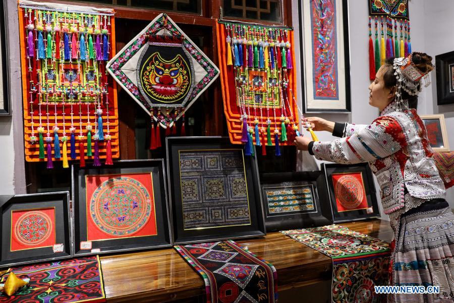 A woman of the Miao ethnic group arranges handicrafts at a poverty alleviation workshop in Huawu village, Xinren Miao township of Qianxi county, Bijie city, Southwest China's Guizhou province, Feb 3, 2021. (Photo/Xinhua)