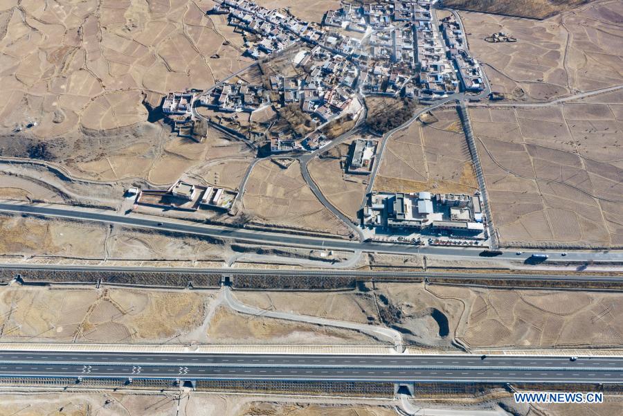 Aerial photo taken on Jan. 28, 2021 shows a section of the Lhasa-Nagqu high-grade highway (lower part) and the Qinghai-Tibet railway, along with a village in southwest China's Tibet Autonomous Region. The road network in Tibet Autonomous Region now stretches over 117,000 km, up 50 percent from the end of 2015, as the region continues to see improving connectivity. The mileage of the rail network in the region has reached 954 km, according to data released recently. Since late 2012, China has been strengthening its infrastructure investment in Tibet. So far, roads have connected 95 percent of the township-level administrations and 75 percent of the incorporated villages in the region. (Xinhua/Sun Fei)