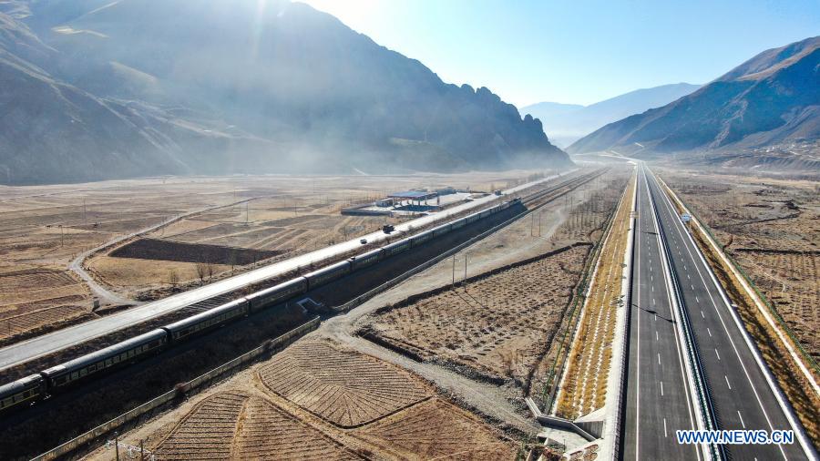 Aerial photo taken on Jan. 28, 2021 shows a section of the Lhasa-Nagqu high-grade highway (R) and the Qinghai-Tibet railway in southwest China's Tibet Autonomous Region. The road network in Tibet Autonomous Region now stretches over 117,000 km, up 50 percent from the end of 2015, as the region continues to see improving connectivity. The mileage of the rail network in the region has reached 954 km, according to data released recently. Since late 2012, China has been strengthening its infrastructure investment in Tibet. So far, roads have connected 95 percent of the township-level administrations and 75 percent of the incorporated villages in the region. (Xinhua/Jigme Dorje)